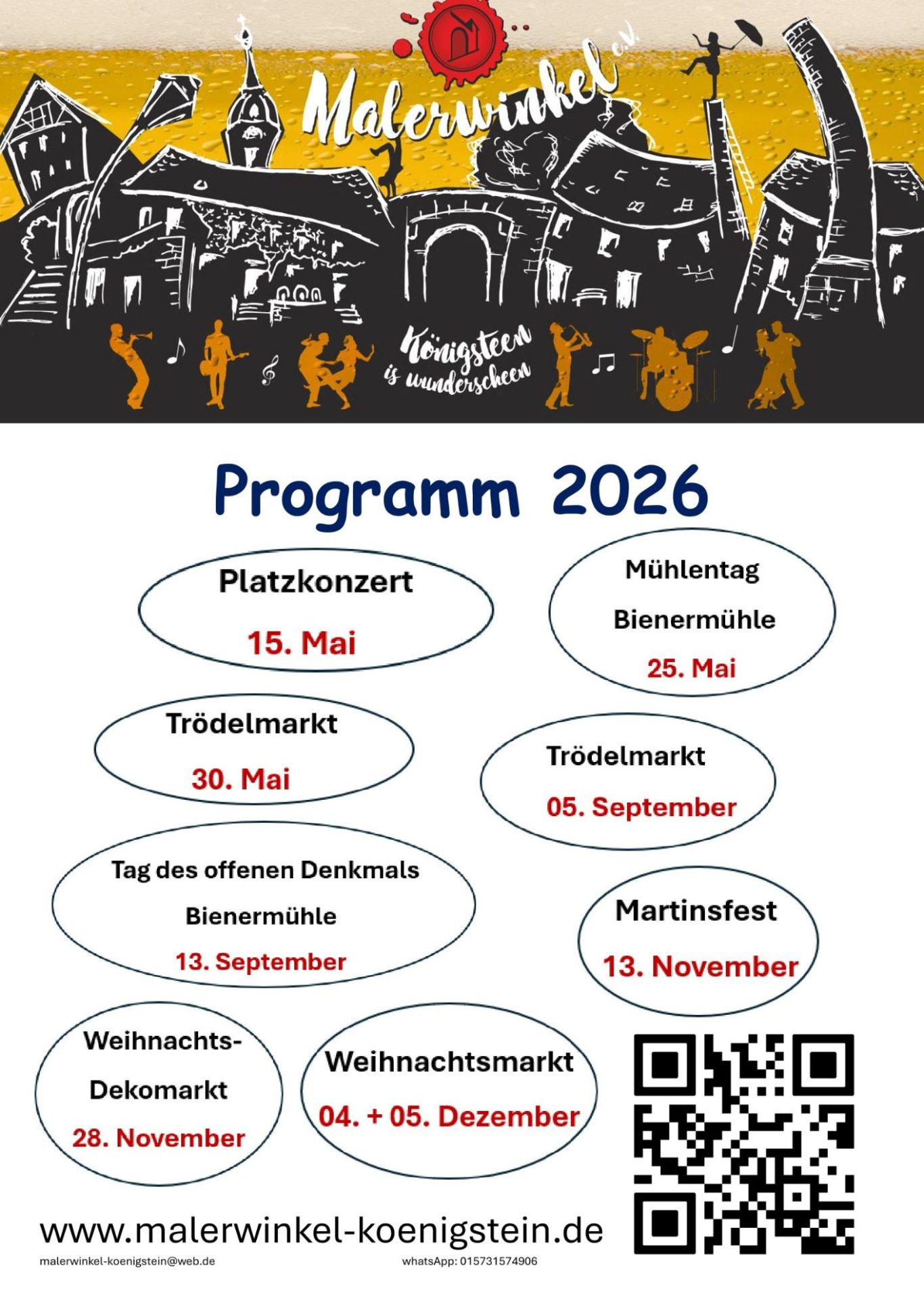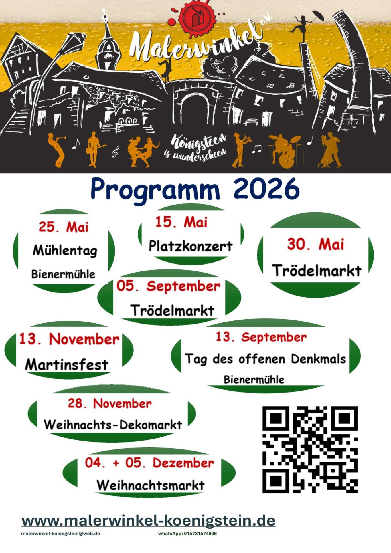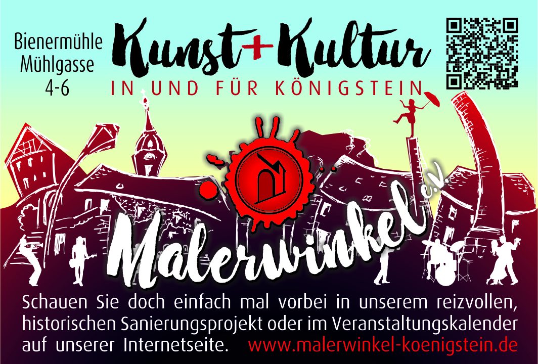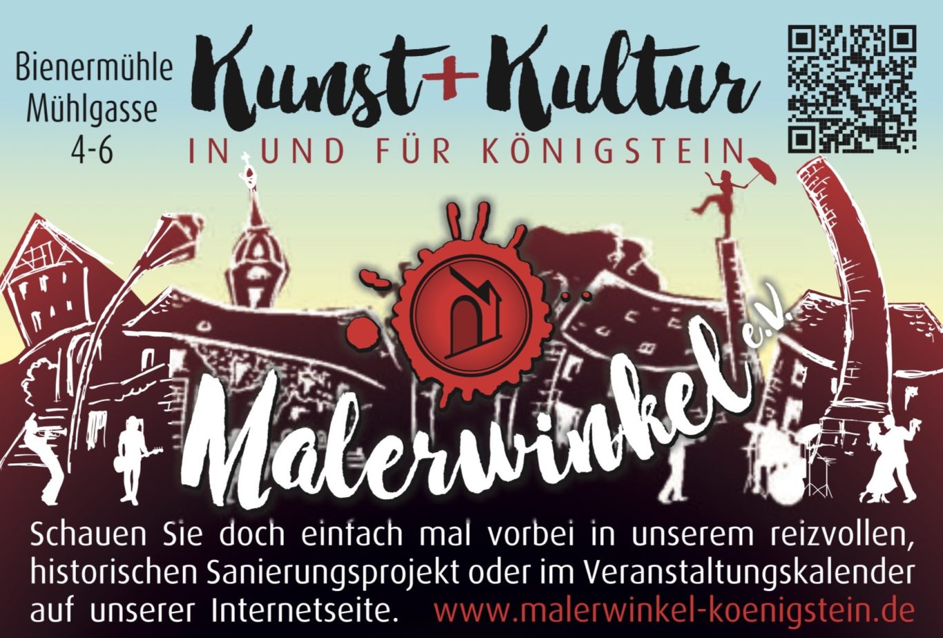 Getreu diesem Motto möchte unser Verein mit Kunst, Kultur und Unterhaltung den Malerwinkel in Königstein aus seinem Dornröschenschlaf erwachen lassen. Die alte Brettschneidemühle mit Meisterhaus und Vogtei hat immer noch ihren Charme. Der Hof dient uns als Veranstaltungsort für Musik, Tanz, Theater, Vernissagen und Lesungen. Wir freuen uns über alle Gäste, Einwohner und Freunde, die zu unseren Veranstaltungen kommen.